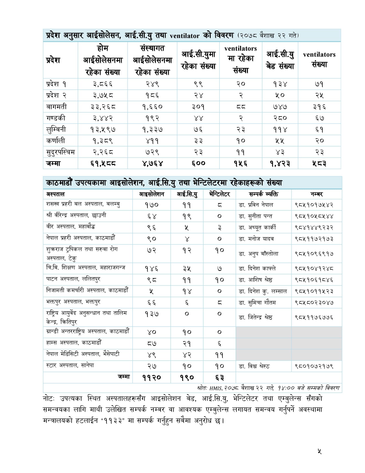 सरकारले कोरोना उपचारका लागि छुट्याएका उपत्यकाका अस्पतालका बेड, आइसीयू र भेन्टिलेटर लुकाइएको प्रष्ट देखिन्छ । यति मात्रै होइ सरकारले देशभर कोरोना संक्रमितको उपचारका लागि भन्दै छुट्याइएका आइसीयू बेडको संख्या १४ सय २३ रहेको छ, तर देशभरका कोभिड अस्पतामा ६०० जना मात्रै आइसीयुमा भर्ना भएको सरकारी रेकर्ड छ । अर्कोतिर ५ सय ८३ भेन्टिलेटर मध्ये १ सय ५६ मा मात्रै संक्रमितको उपचार भैरहेको छ । बिशेषगरी तिब्र संक्रमण देखिएका बागमती प्रदेश र लुम्बिनी प्रदेशका अस्पतालले बेड लुकाएको आशंक बढाउनेगरि सरकारले नै सार्वजनिक गरेको यो तथ्यांक पनि हेर्नुहोस् ।