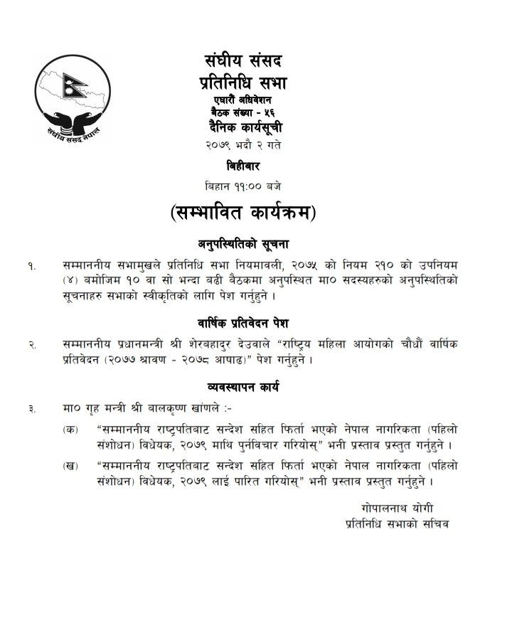 बिहीबार बिहान ११ बजे बस्ने प्रतिनिधिसभा बैठकको सम्भावित कार्यसूचीमा गृहमन्त्री बालकृष्ण खाणले राष्ट्रपतिबाट फिर्ता आएको नागरिकता विधेयक पारित गरियोस् भनी पेश गर्ने संसद सचिवालयले जनाएको छ ।