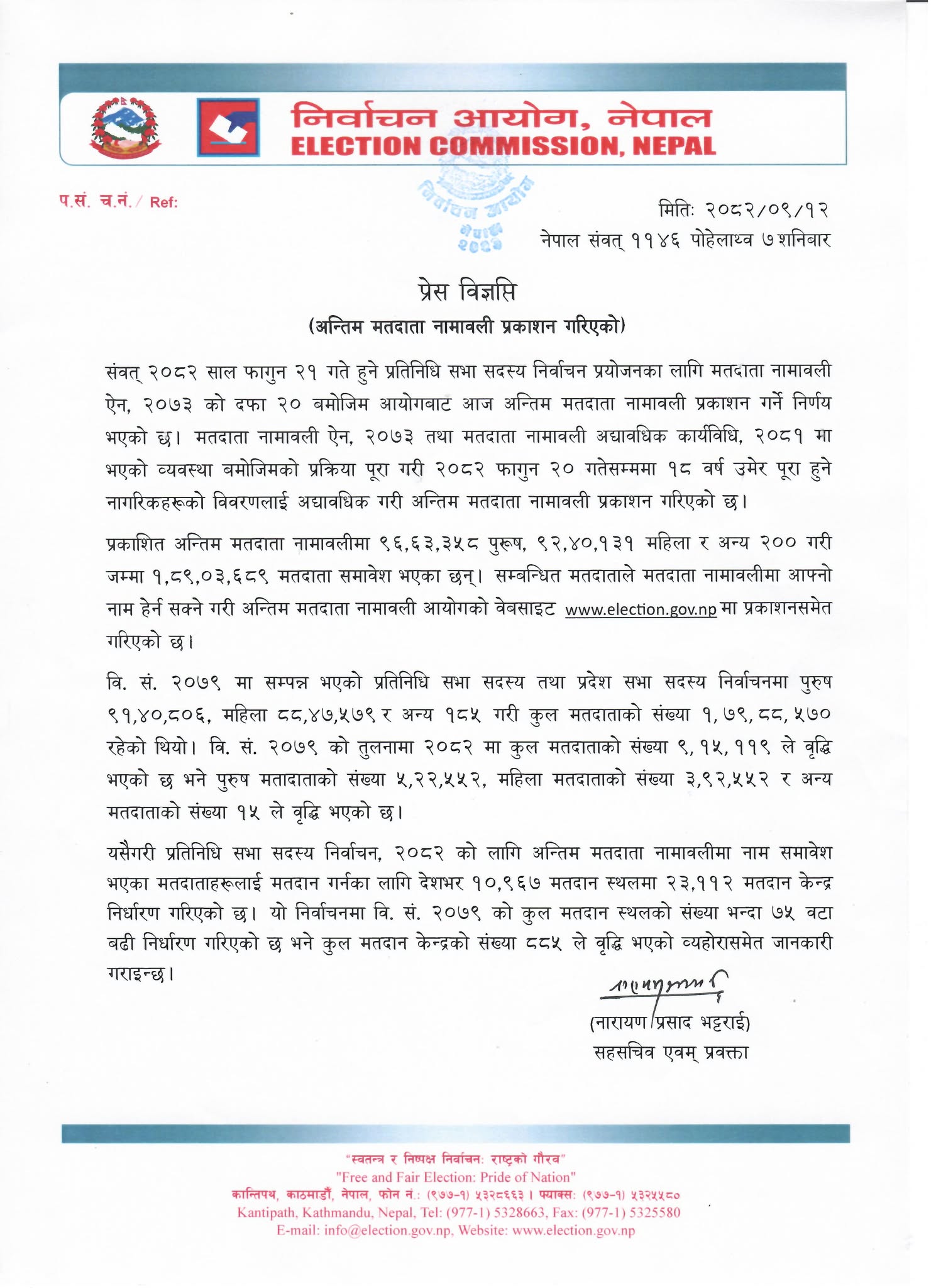 प्रकाशित अन्तिम मतदाता नामावलीमा ९६,६३,३५८ पुरुष, ९२,४०,१३१ महिला र अन्य २०० गरी जम्मा १,८९,०३,६८९ मतदाता समावेश भएको उल्लेख छ।