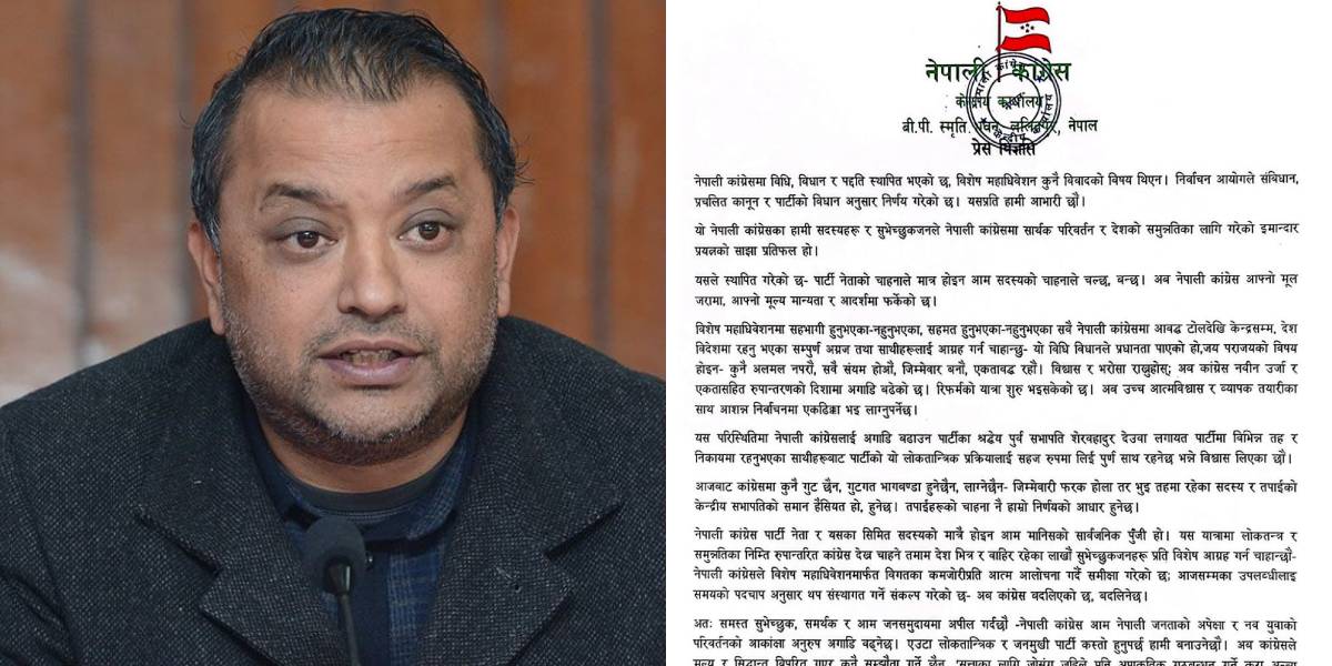 एक विज्ञप्ति जारी गर्दै थापाले नेपाली कांग्रेसमा विधि, विधान र पद्धति स्थापित भएको बताएका छन् । ‘विशेष महाधिवेशन कुनै विवादको विषय थिएन। निर्वाचन आयोगले संविधान, प्रचलित कानुन र पार्टीको विधान अनुसार निर्णय गरेको छ। यसप्रति हामी आभारी छौँ ’ उनले भनेका छन् ।