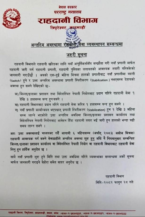 बिहीबार जारी गरिएको सूचना अनुसार जिल्ला तथा इलाका प्रशासन कार्यालय र विदेशस्थित नेपाली नियोगबाट प्रदान गरिने राहदानी सेवा एकदेखि तीन हप्तासम्म बन्द हुन सक्नेछ । त्यस्तै, राहदानी विभागबाट प्रदान गरिने सेवा करिब एक हप्तासम्म बन्द हुन सक्ने जनाइएको छ ।