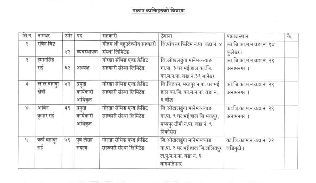 काठमाडौ । काठमाडौँको कुलेश्वरस्थित गौतमश्री बहुउद्देश्यीय सहकारी संस्था लिमिटेडका व्यवस्थापक रवीन बिष्टसहित ५ जनालाइ प्रहरीले पक्राउ गरेको छ ।